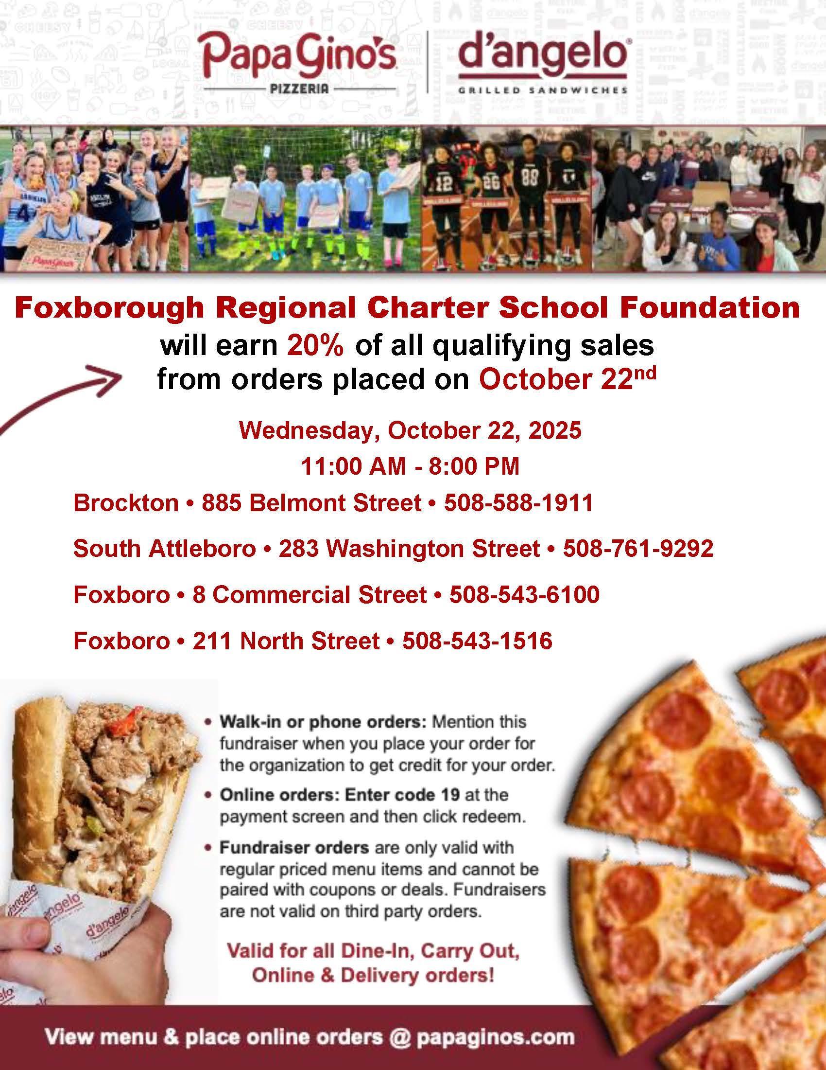 Join the Foxborough Regional Charter School Foundation for our next Papa Gino’s Fundraiser on Wednesday, October 22, 2025, between 11:00 AM and 8:00 PM. Enjoy your favorite pizza, pasta, and subs from one of four participating Papa Gino’s locations—and 20% of your order will be donated directly to the FRCS Foundation!